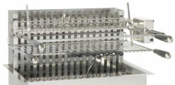 – Parrilla de cocción de Acero Inoxidable tipo Argentina (con varillas en forma de V) y recoge-grasas regulable a 3 alturas: 62,5 x 55 cm (ancho x fondo).