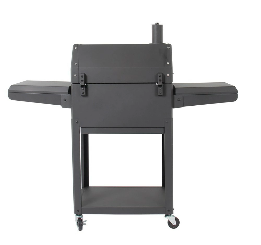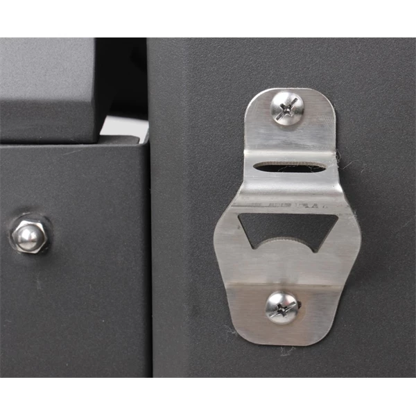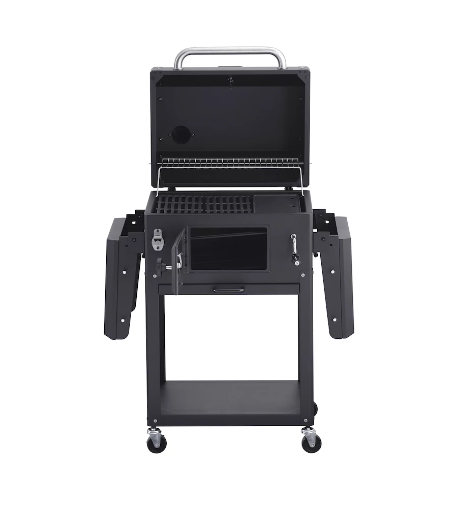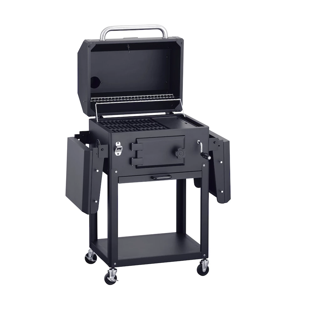 Esta barbacoa viene muy equipada de serie, incluyendo un práctico abridor para botellas, ganchos porta utensilios, una bandeja para las brasas que se puede ajustar en altura fácilmente con la manivela situada en la parte delantera de la barbacoa, termómetro integrado en la tapa y los estantes laterales son plegables lo que lo hacen perfecta para guardarla.