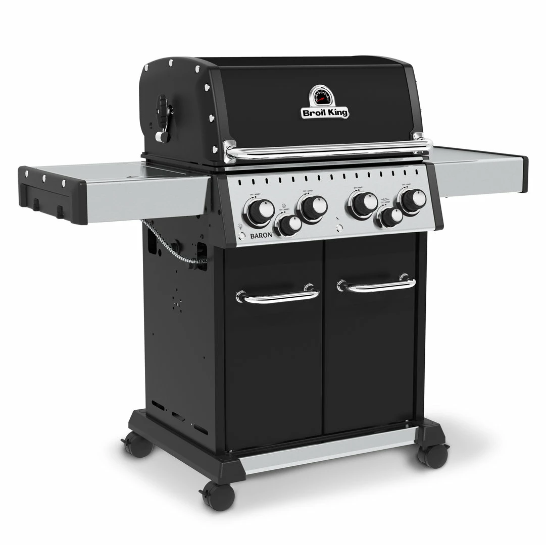 Las barbacoas Broil King de la serie Baron son fabricadas con los mejores materiales, tiene una amplia zona de cocción y son muy potentes satisfaciendo con creces nuestras necesidades. Las robustas parrillas de cocción son de hierro fundido y hacen que retengan el calor con lo que conseguiremos dorar rápidamente nuestros alimentos además son reversibles por un lado son canales huecos v y por el otro son en ^ ideal para dorar y marcar alimentos. Su amplia tapa es perfecta para utilizar nuestra barbacoa como un horno (cocción indirecta) perfecto para asar ternera, pavo, etc. Las barbacoas están construidas con una altísima calidad y con una potencia insuperable.