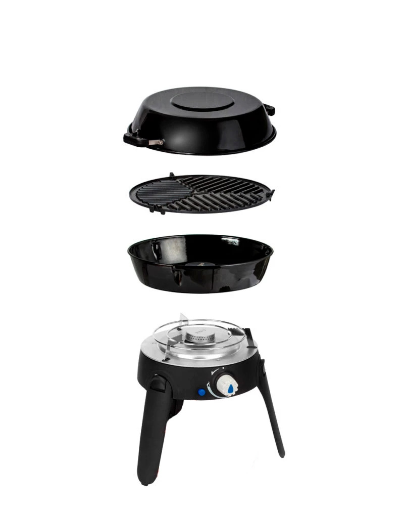 Esta barbacoa polivalente a gas transportable tan solo pesa 4 Kg. Dispone de diferentes superficies de cocinado intercambiables: soporte para cazuelas, paellas etc., una plancha barbacoa antiadherente y una cazuela que al mismo tiempo pude utilizarse como tapa. (La Safari Chef Lite es la versión básica de la Safari Chef 2 baja presión (LP) y no incluye la plancha lisa).