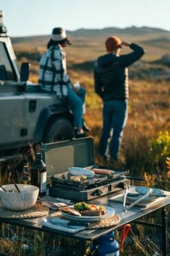 No dejes que su tamaño le engañe, la Cocina 2 Cook 3 Pro Deluxe no conoce límites. Es perfecta para cocinar para 6 personas. Esta versátil cocina / barbacoa viene con dos soportes para ollas, una plancha lisa y una plancha rugosa. Incluye una práctica bolsa de transporte para facilitar su transporte y almacenamiento, por lo que es ideal para cualquier actividad al aire libre.