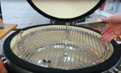 3. HORNEAR: La barbacoa kamado Monolith puede cocinar auténticas Pizzas con el mismo sabor que la cocción en un horno de leña. Se alcanzan fácilmente temperaturas hasta 350 / 400 °C y puedes cocinar la Pizza perfecta en un máximo de 3 minutos, o bajar la temperatura y cocinar el pan. No hay necesidad de invertir en un horno por separado, solamente necesitarás la piedra deflectora con elevador. Se coloca el elevador y encima de éste la piedra deflectora.