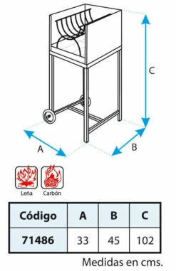 Cajón con carro fabricado en hierro forjado con pintura resistente a 800 ºC, soporte para la leña y base de ladrillo refractario.