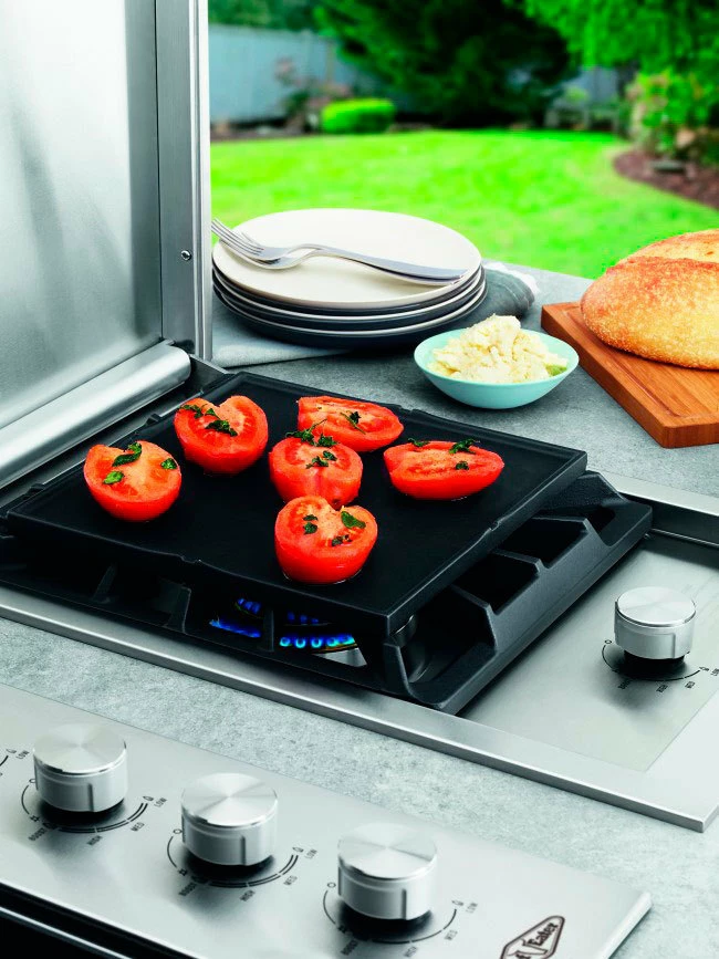 Rápido calentamiento: Potente quemador de triple anillo con salida de cuatro vías. Ideal para cocinar en sartén como en wok, incorpora una plancha reversible de hierro fundio que cuenta con una cara con la superficie plana y la otra cara con la superficie rugosa.