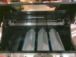 – Zona cocción dispone de 1 plancha reversible de 32 x 49 cm. + 1 parrillas de 32 x 49 cm. + 1 parrillas de 16 x 49 cm. de hierro fundido esmaltada en porcelana.