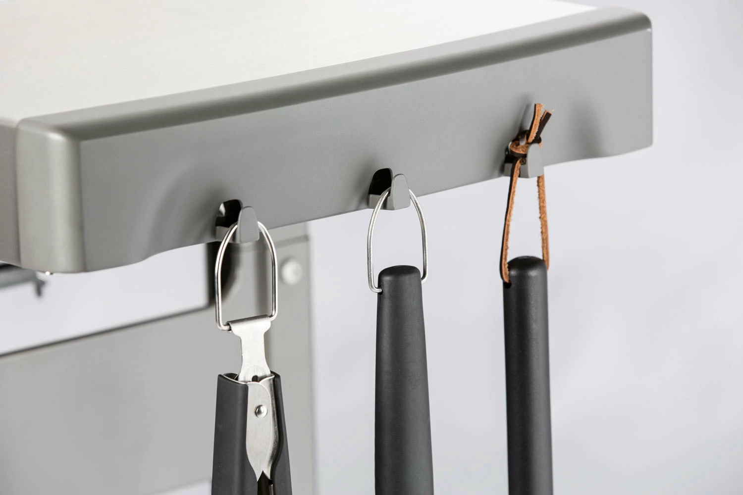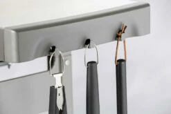 Cuelgue sus espátulas, pinzas, cepillos para parrillas y demás utensilios de barbacoa en los ganchos para utensilios integrados en la barbacoa. Los tres ganchos con los que cuentan cada una de las mesas laterales facilitan el acceso y la organización del espacio de trabajo.