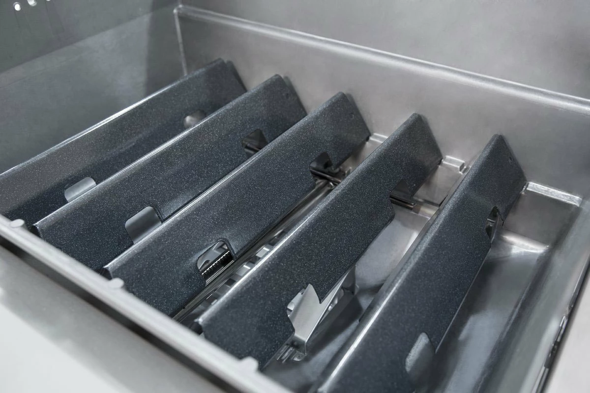 Las clásicas barras Flavorizer de Weber están orientadas con el ángulo perfecto para atrapar los jugos, que humean y crepitan para aportar ese irresistible sabor a barbacoa tan familiar y deseado. Las gotas que no se vaporizan por efecto de las barras Flavorizer siguen la pendiente de su exclusivo ángulo y se canalizan fuera de los quemadores hasta el sistema de recogida de grasa.