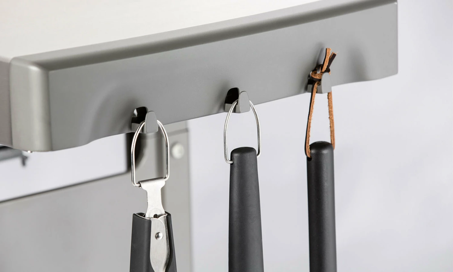 Cuelgue sus espátulas, pinzas, cepillos para parrillas y demás utensilios de barbacoa en los ganchos para utensilios integrados en la barbacoa. Los tres ganchos con los que cuentan cada una de las mesas laterales facilitan el acceso y la organización del espacio de trabajo.